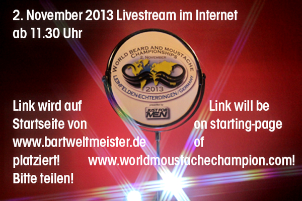 You can not come to the WORLD BEARD & MOUSTACHE CHAMPIONSHIPS 2013? You will not miss anything. From 11.30 clock until the awards ceremony, you can track everything in our live stream on the internet.